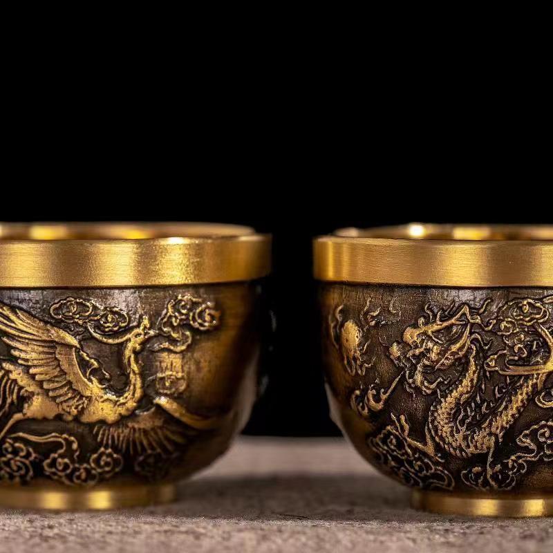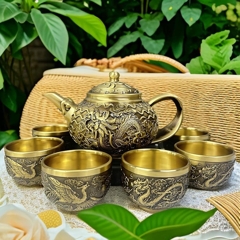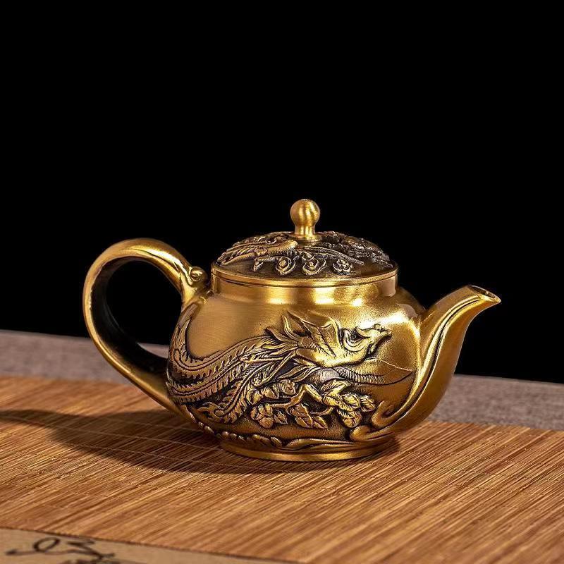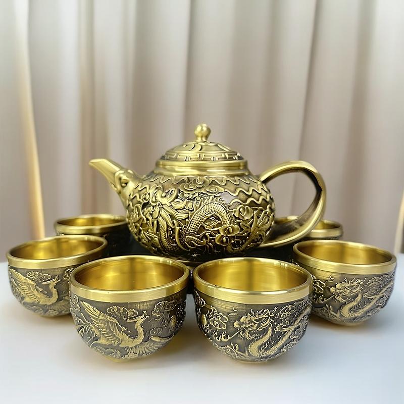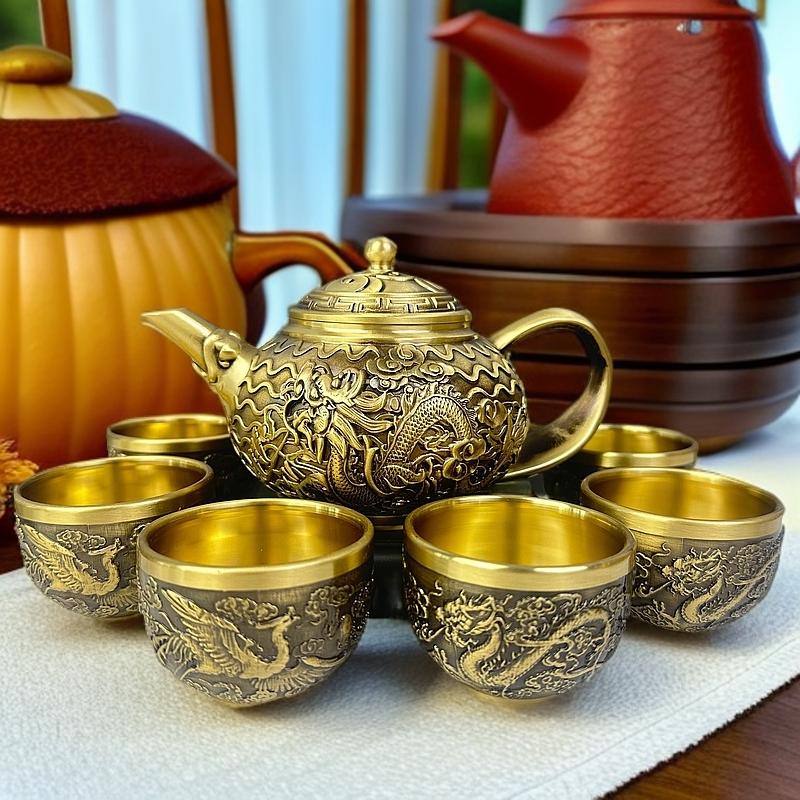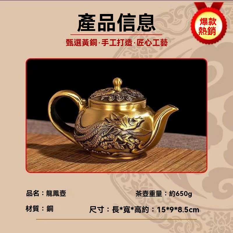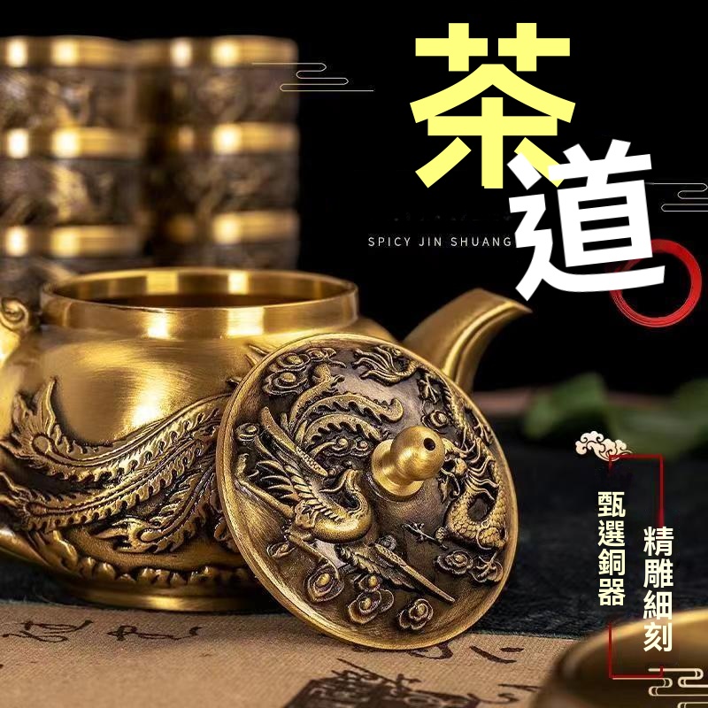 12分鐘前新款套裝【一壺八杯】中式浮雕黃銅龍鳳壺復古大容量龍嘴壺擺件 - 純黃銅茶具 龍鳳10件組【1茶壺8杯1底座】-NT$2698