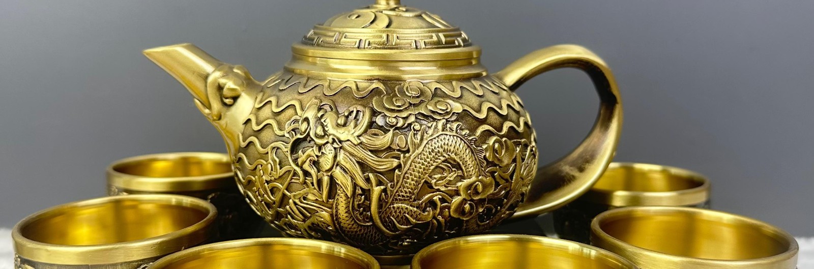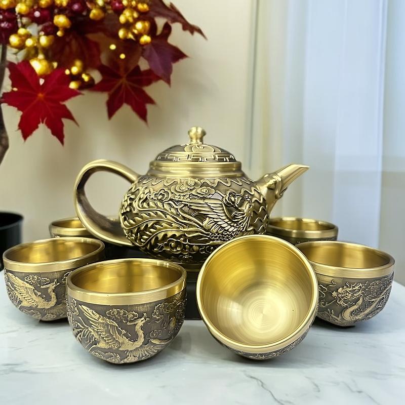 半小時前新款套裝【一壺八杯】中式浮雕黃銅龍鳳壺復古大容量龍嘴壺擺件 - 純黃銅茶具 龍鳳5件組【1茶壺4杯1托盤】-NT$1698