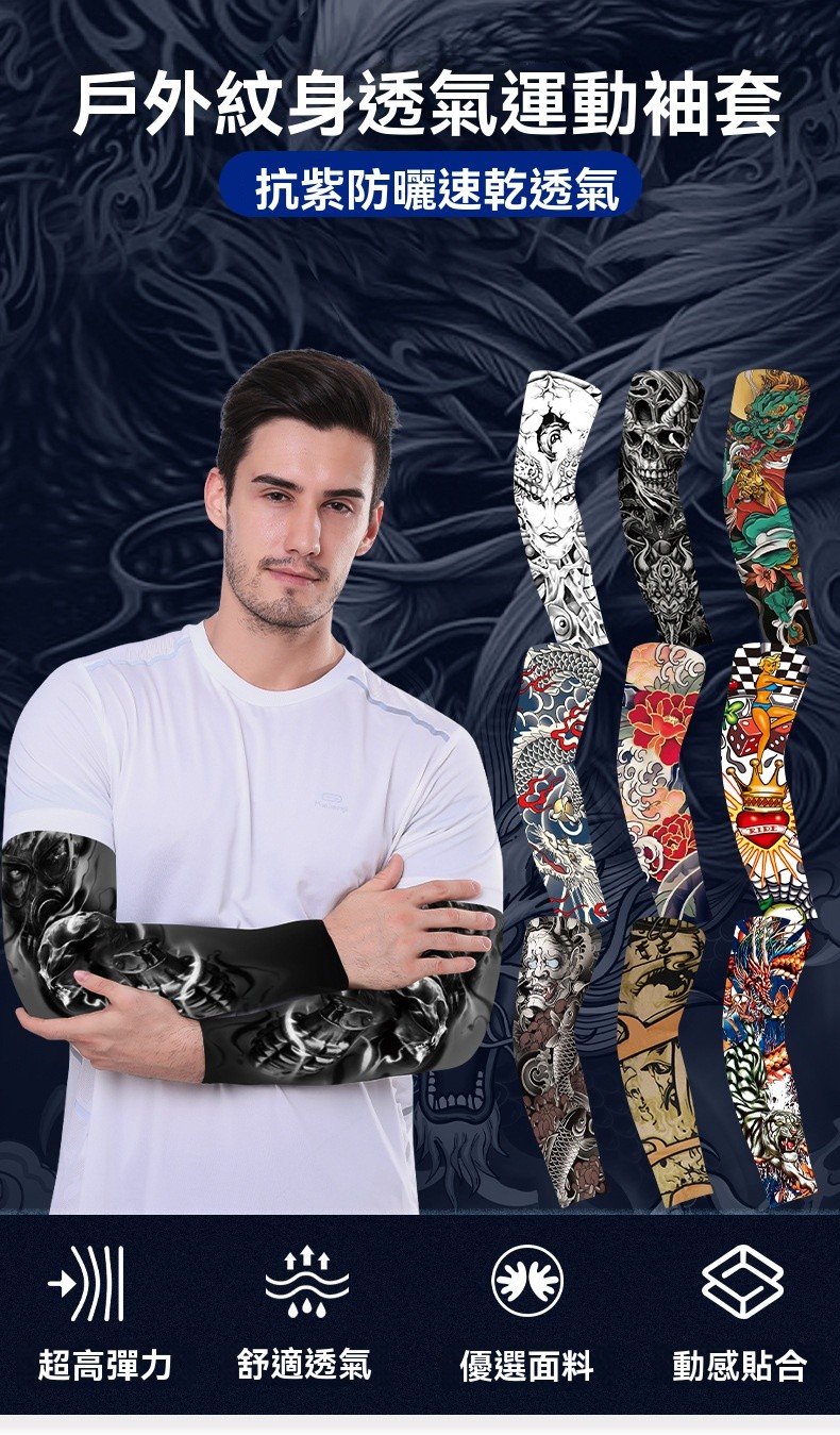 半小時前夏季騎行防曬紋身袖套仿真刺青速幹護臂戶外運動遮陽透氣高彈冰袖 - 體驗!!【買二送二】4入組-NT$980